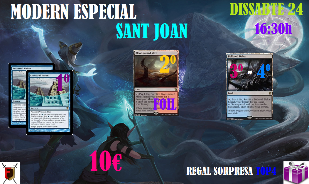 Inscripción: 10€ Formato: Modern Premios: 1º 2x Ancestral Visions 2º 1x Bloodstained Mire (FOIL) 3º y 4º Polluted Delta + Premio Especial a el top 4 (magico y secreto) Premios calculados para 12 personas, modificación de estos según participación