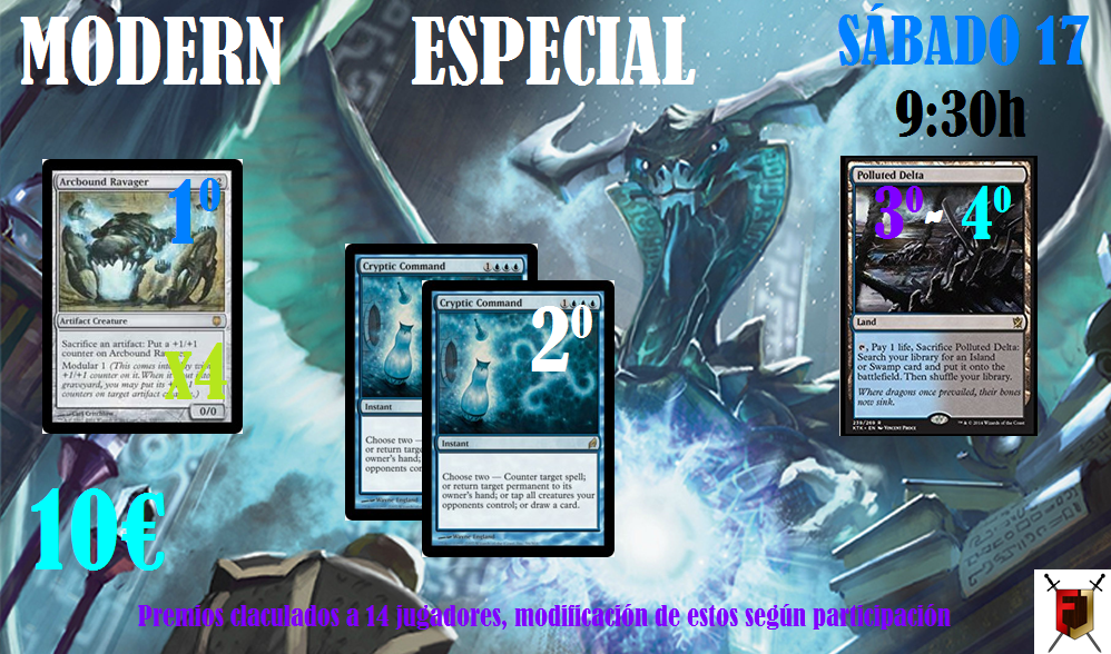 Inscripción: 10€ Formato: Modern Premios: 1º 4x arcbound ravager 2º 2x cryptic command 3º-4º polluted delta premios calculados para 14 personas top según participación