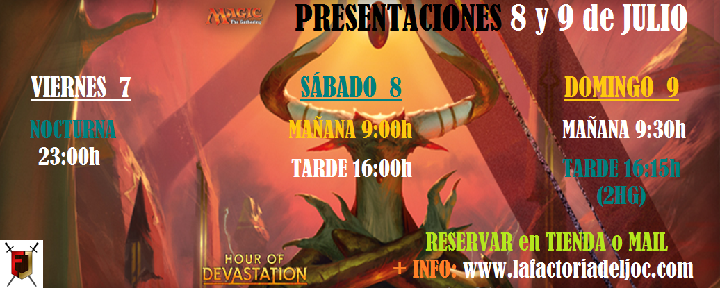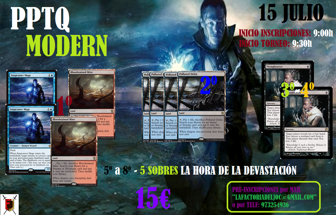 Inscripción: 3€ Formato: Modern Premios: Presentación hora de la devastación y promo de fnm según participación.