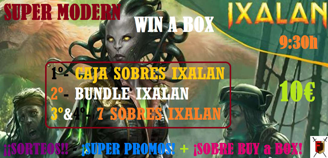 Inscripción: 10€ Formato: Modern Premios: 1º; Caja de Sobres Ixalan 2º; Bundle Ixalan 3º y 4º; 7 Sobres Ixalan ¡¡Super PROMOS a sorteo!!! ¡¡Sorteo Sobre de Buy a Box e IXALAN!! Premios calculados a 16 jugadores, modificación de estos según participación. Top según participación.