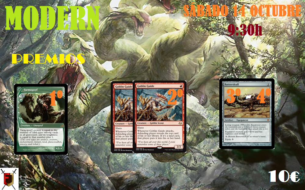 Inscripción: 10€ Formato: Modern Premios: 1º; Tarmogoyf ( visiones) 2º;2x Goblin guide modern masters edition 3º & 4º; Batterskull calculado a 12 jugadores