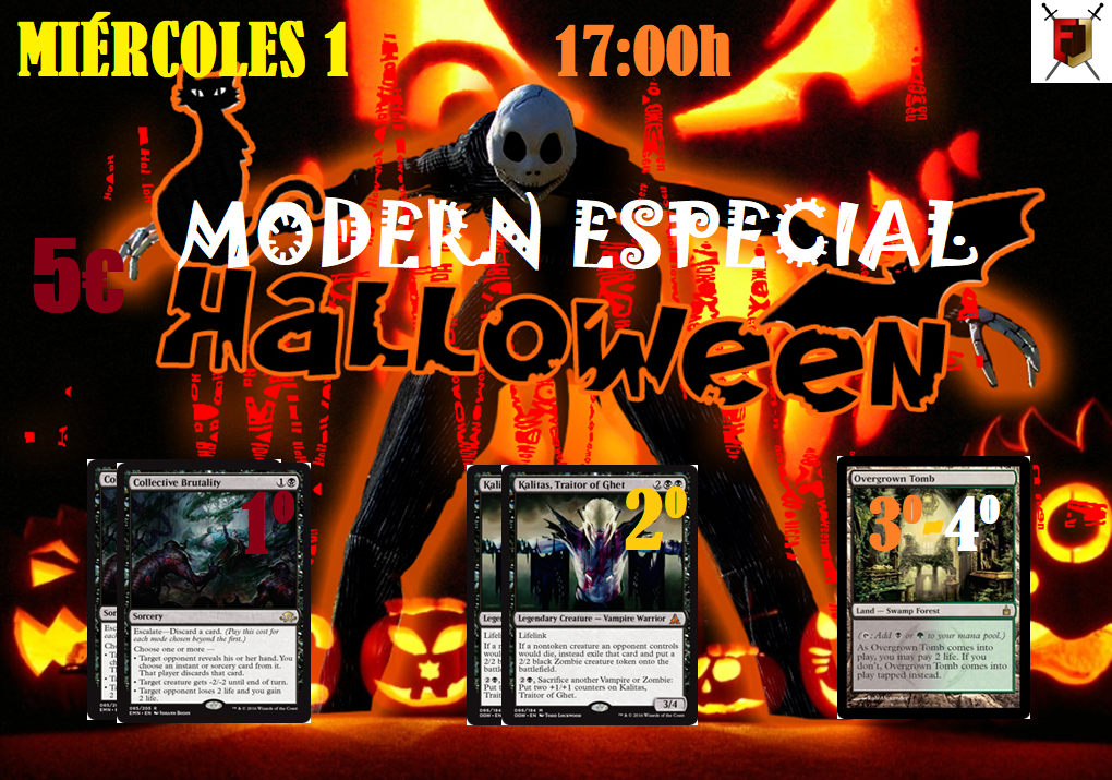 Inscripción: 5€ Formato: Modern Premios: 1º; 2Collective brutality 2º; 2Kalitas traitor of ghet 3º-4º; 1 Overgrown tomb