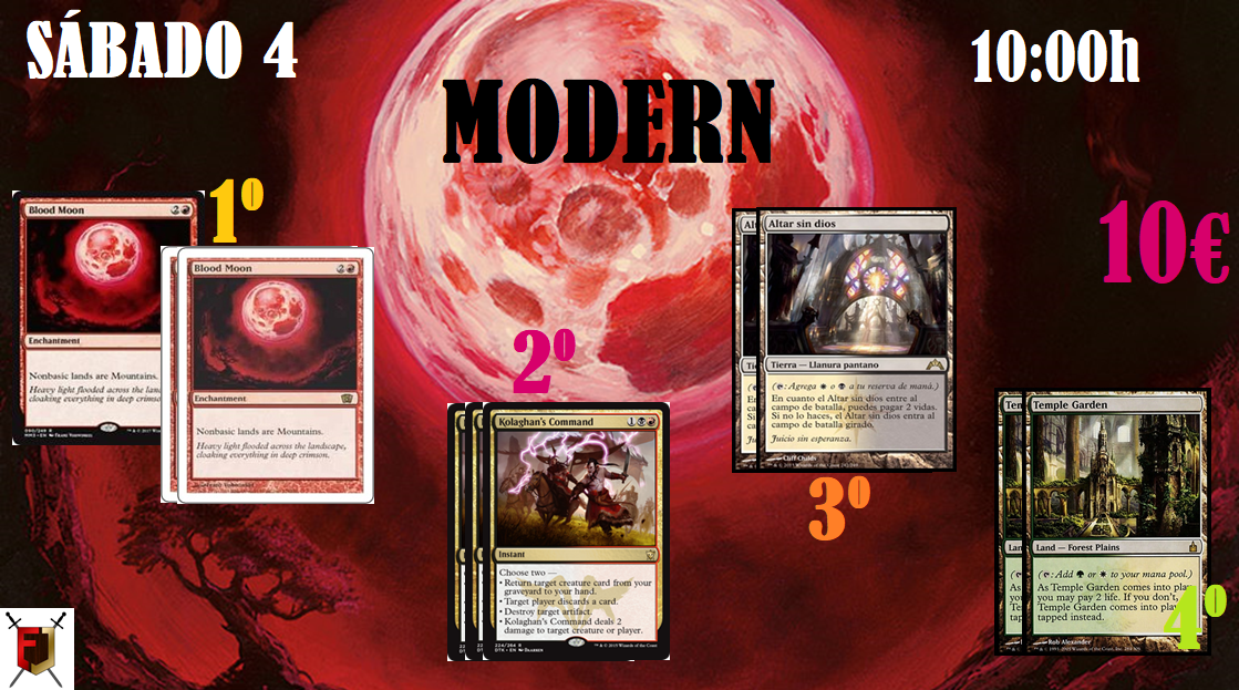 Inscripción: 10€ Formato: Modern Premios: 1º; 3 Blood moon (1x mm 2x 8th) 2º; 3 Kolaghan's command 3º; 2 Altar sin dios 4º; 2 Jardin del templo