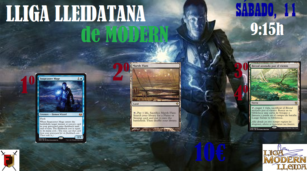 Inscripción: 10€ Formato: Modern Premios: 1º: 1 Snapcaster 2º: 1 Marsh Flats 3º-4º: Brezal azotado por el viento