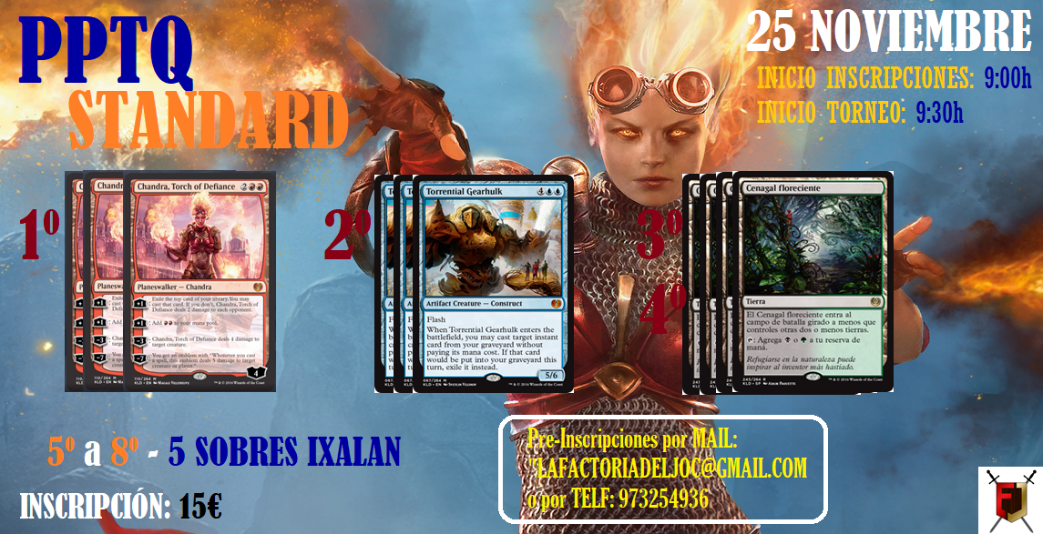 Inscripción: 15€ Formato: Estándar Competitivo Premios: 1º; 3 Chandra torch of defiance + plaza para el rptq 2º; 3 Mecatitan torrencial 3º-4º; 4 Cenagal floreciente 5º al 8º; 5 Sobres de Ixalan *Torneo calculado a 24 jugadores, modificación de premios según participación. *Se requiere lista de mazo.