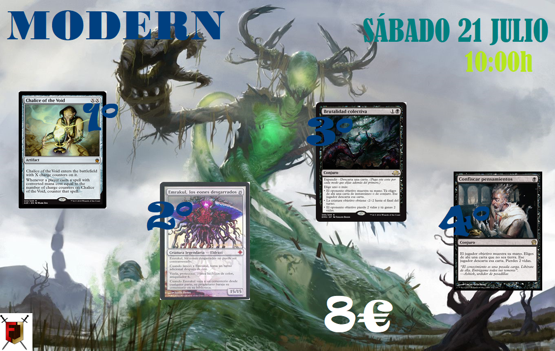 Inscripción: 8€ Formato: Modern Premios: 1º; Caliz del vacio 2º; Emrakul los eones desgarrados 3º; Brutalidad colectiva 4º; Confiscar los pensamientos